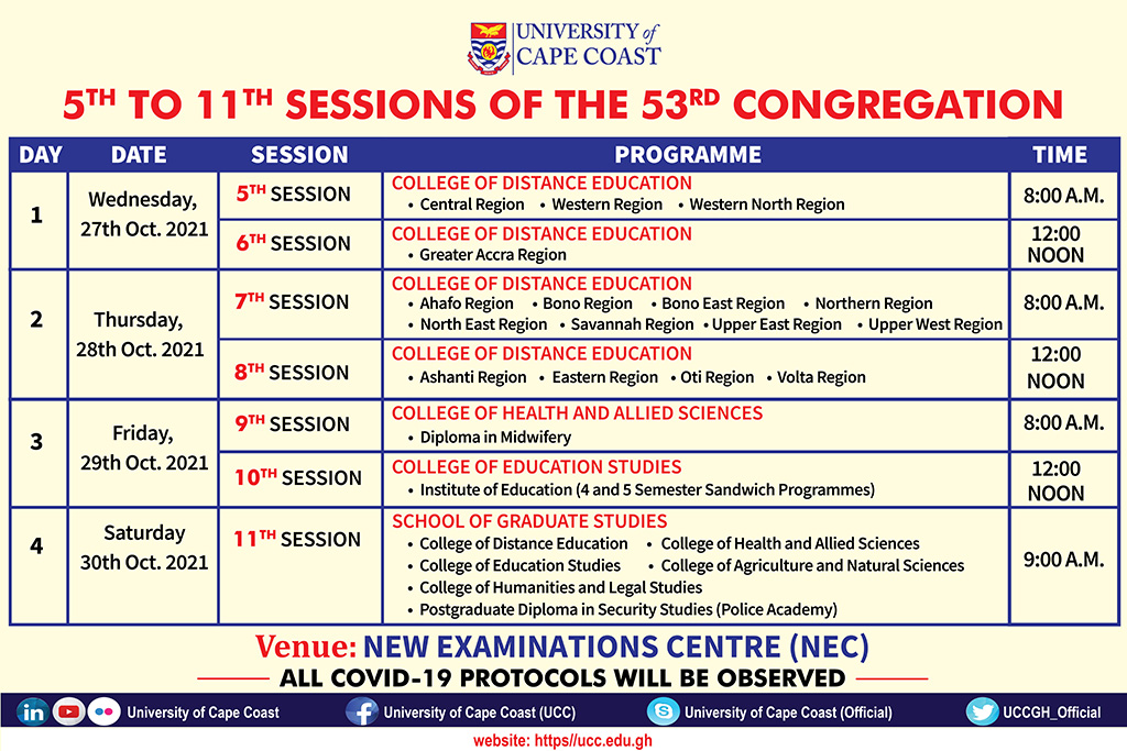It is announced for the information of 2019/2020 Graduands of the College of Distance Education; College of Health and Allied Sciences (Diploma in Midwifery for Ministry of Health Nursing Training Institutions); Postgraduate Diploma in Security Studies (Police Academy) and School of Graduate Studies (SGS) of the University of Cape Coast as well as the general public that, the 5th to 11th Sessions of the 53rd Congregation for the award of diplomas and degrees to persons who completed their programmes of study in the aforementioned academic years will be held at the New Examination Centre (NEC) as follows: