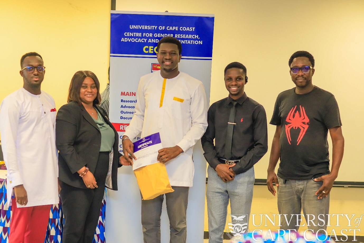 Director of CEGRAD, Prof. Eunice Fay Amissah presenting a certificate of participation to the winners of the debate, UCC Debate Society